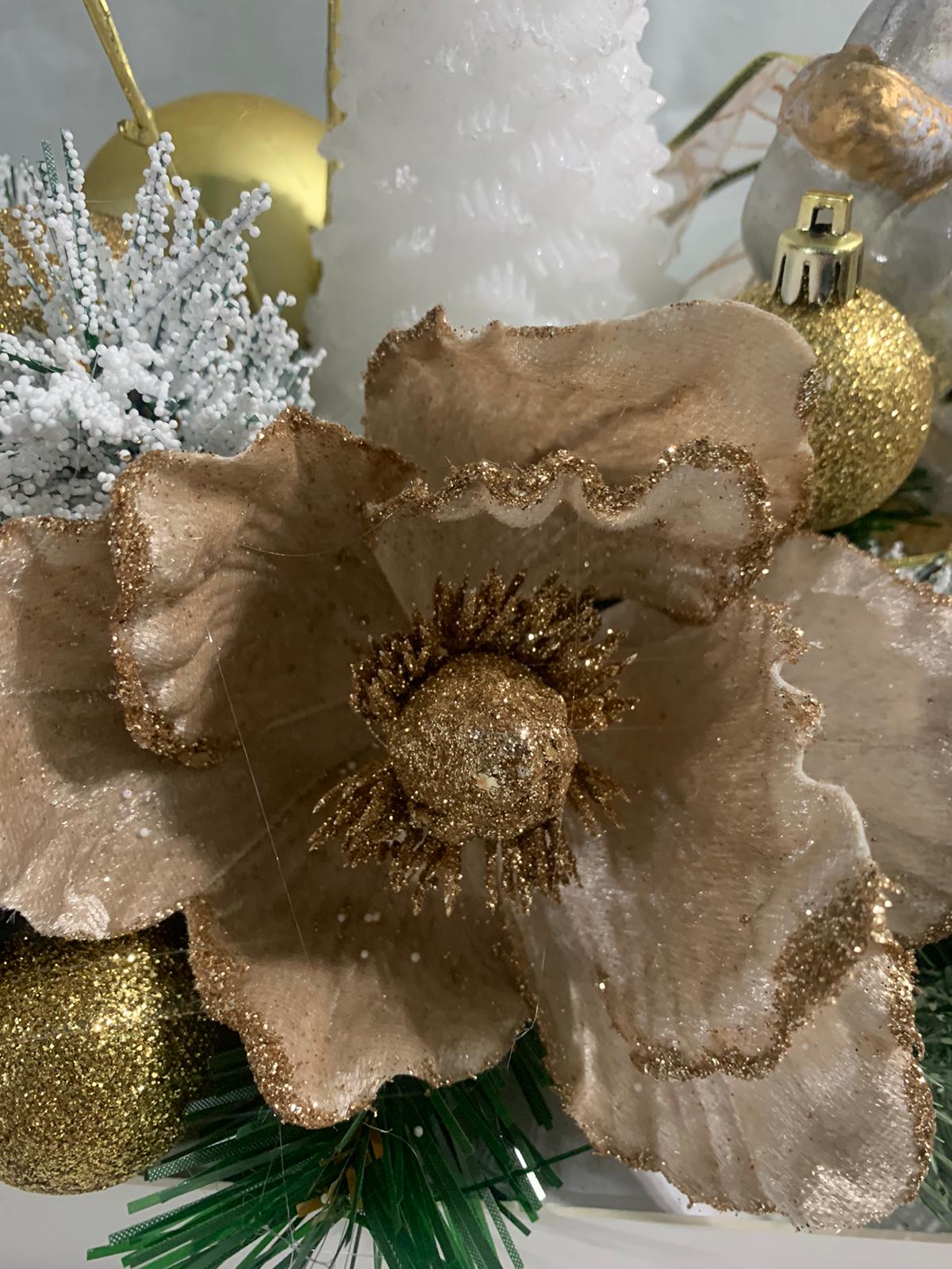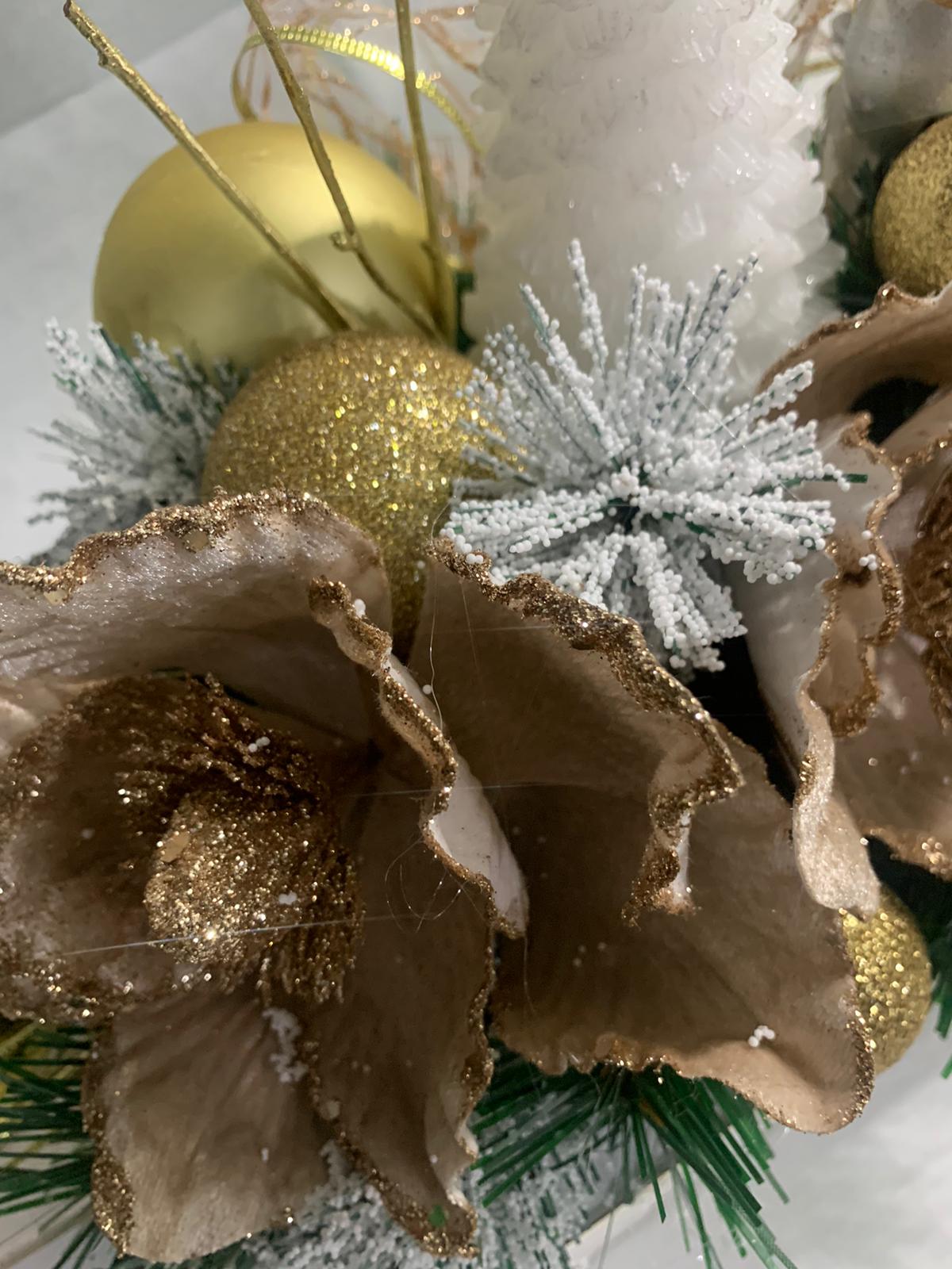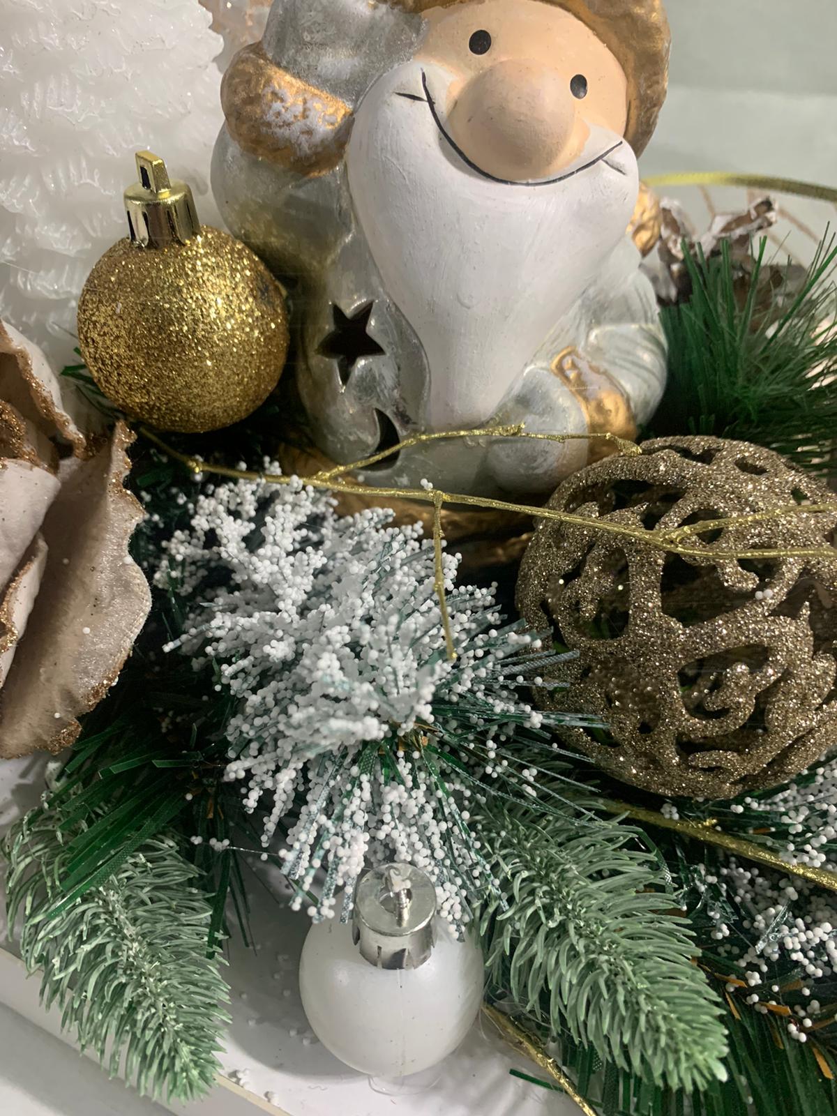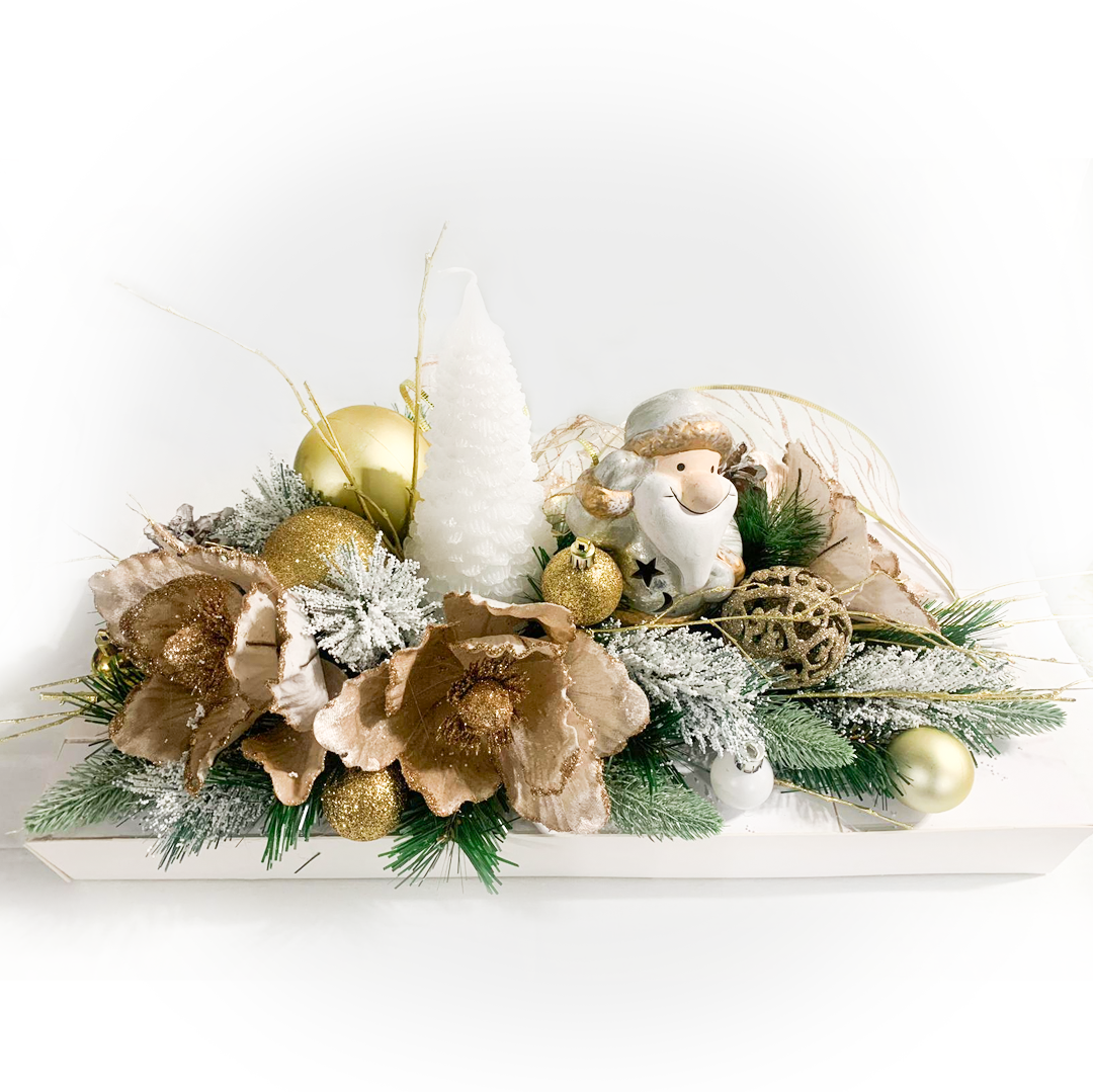 Intr-un colt al sarbatorilor, un aranjament magic de Craciun straluceste. Mosul vesel zambeste impreuna cu o lumanare luminoasa, inconjurat de globuri stralucitoare si o floare aurie, emanand caldura si magia Craciunului. Lumina diafana a lumanarii aduce un farmec aparte, in timp ce Mosul aduce bucurie iar globurile aduc stralucirea sarbatorilor.