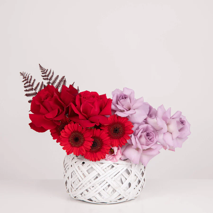 Cosulet, ce contine urmatorul mix de flori proaspete, de inalta calitate: gerbera si trandafiri.