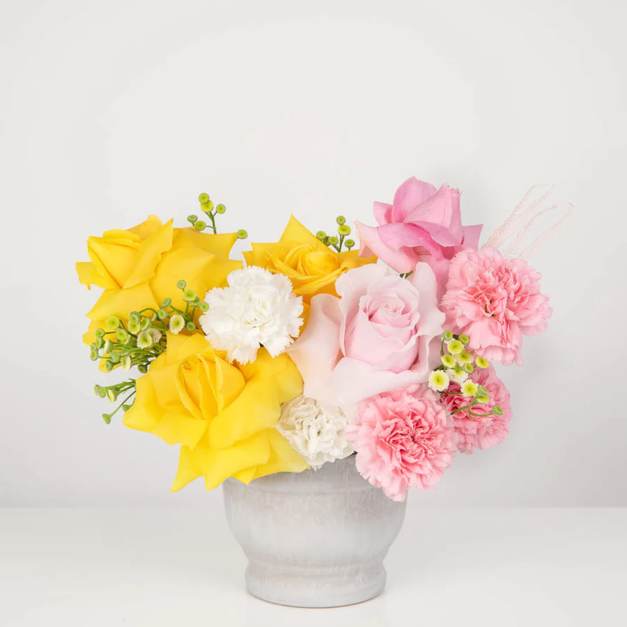 Vas ceramic, ce contine, trandafiri , garofe si alte decoratiuni de inalta calitate.