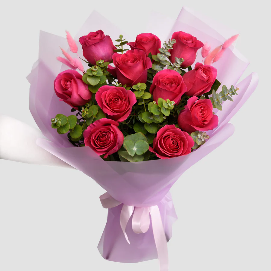 Buchetul contine: 11 trandafiri Pink, eucalipt si alte decoratiuni de inalta calitate, ce compun un buchet impresionant. Detalii Suplimentare: Floristii nostri folosesc doar flori atent selectionate si curatate in buchetele pe care le creeaza, pentru a pastra intotdeauna linia de design modern cu care te-am obisnuit. La produsele naturale pot exista usoare variatii de culoare fata de imaginea prezentata.