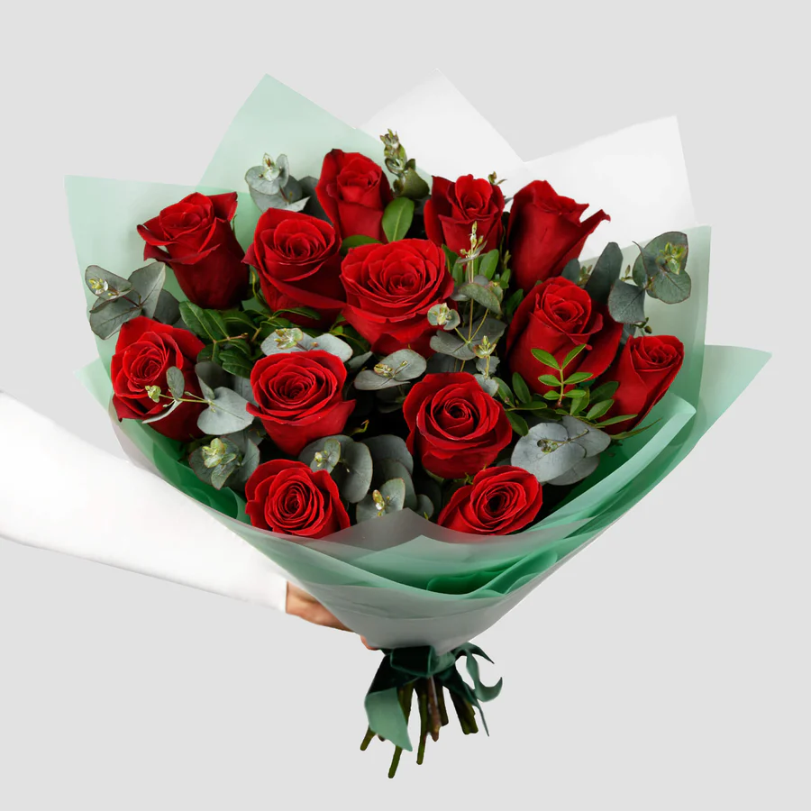 Buchetul contine: 13 trandafiri rosii proaspeti si verdeata de inalta calitate, ce compun un buchet impresionant.