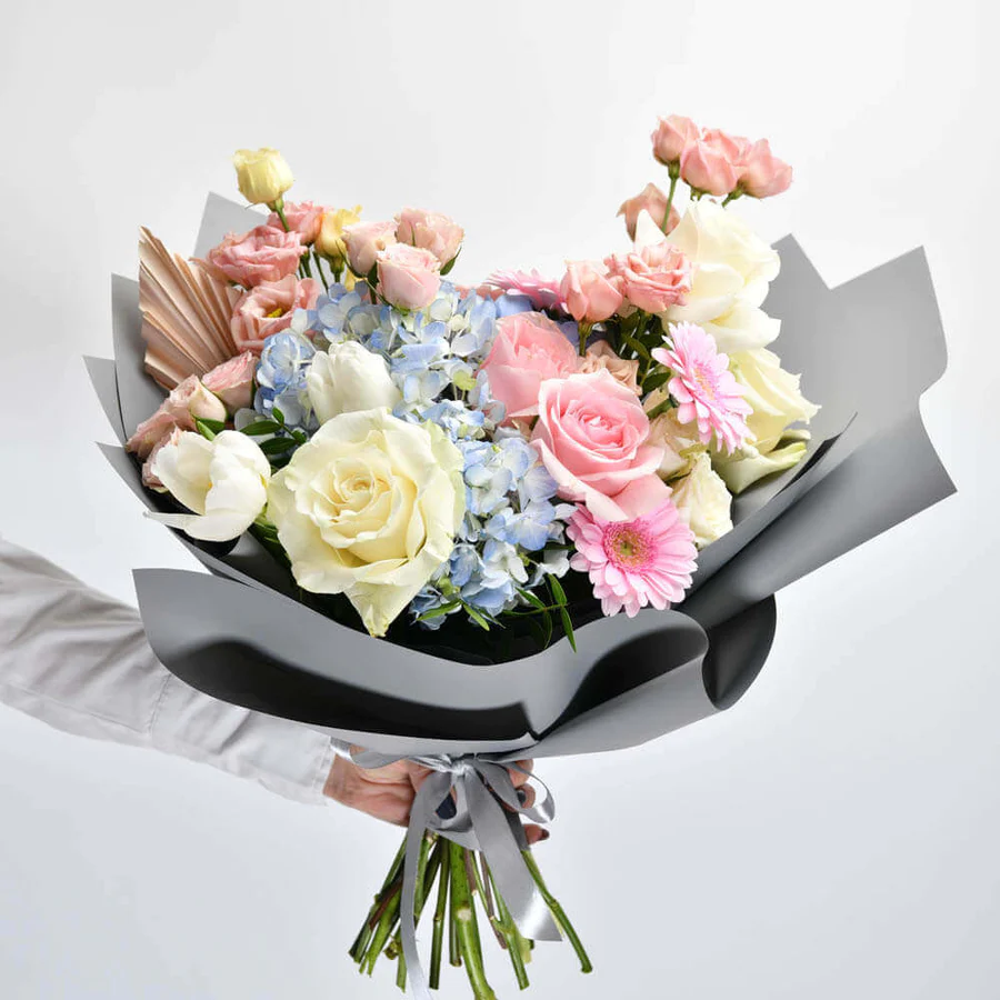 Buchetul contine: hortensie, trandafiri, gerbera, lisianthus, plante decoarative uscate si frunze de verdeta in cantitati variate, alese in functie de disponibilitate si sezon.