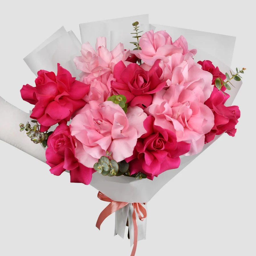 Buchetul contine: 11 trandafiri roz in doua nuante proaspeti si eucalipt, de inalta calitate, ce compun un buchet impresionant. Include ambalaj si felicitare cadou.