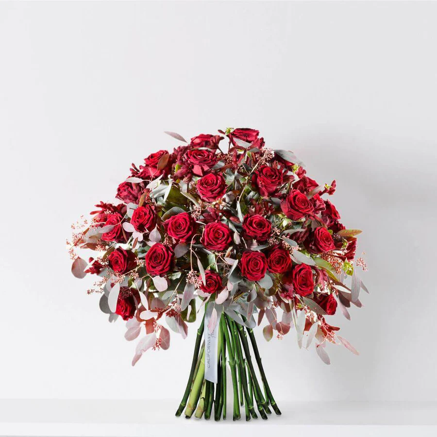 Buchetul contine: 49 trandafiri rosii proaspeti, verdeata de inalta calitate, ce compun un buchet impresionant.