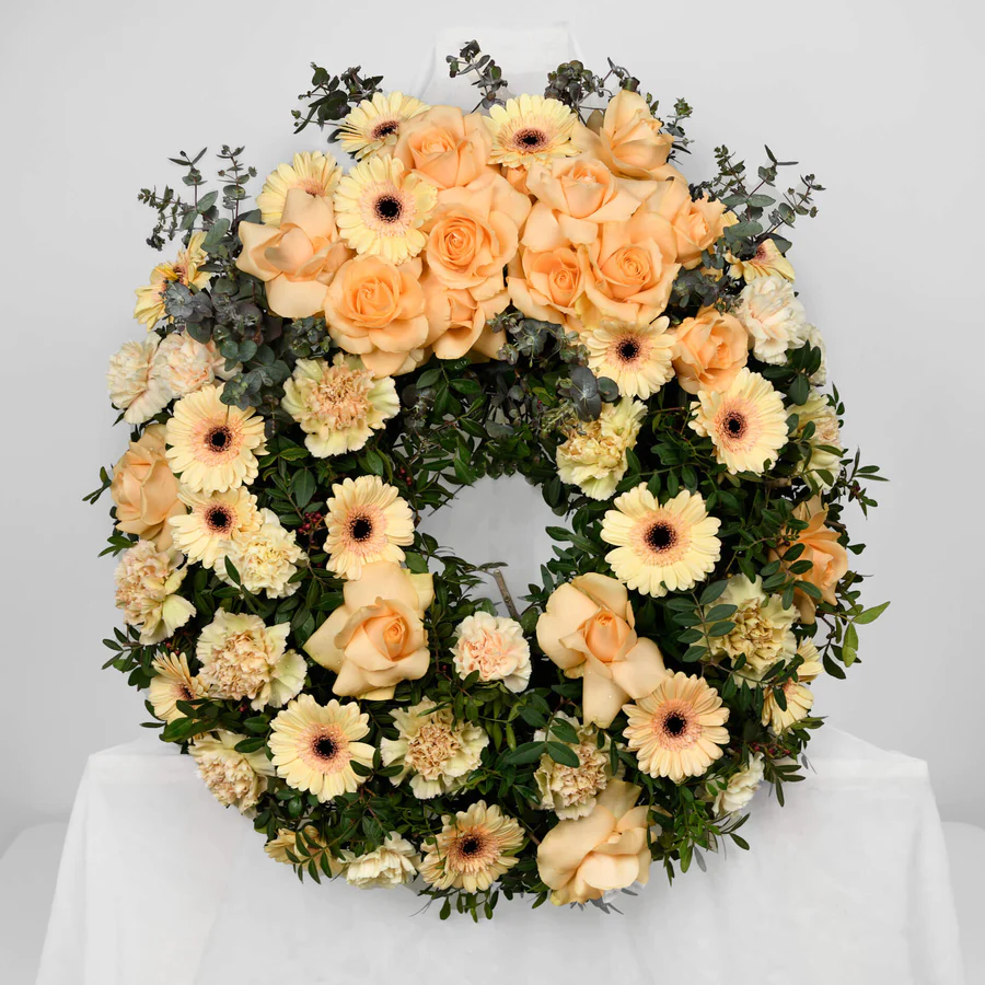 Coroana contine: trandafiri, gerbera, garoafe de inalta calitate , ce compun o coroana impresionanta.