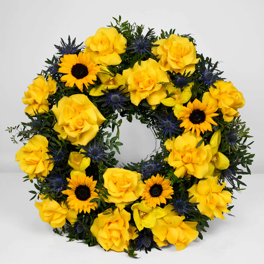 Coroana contine: floarea soarelui, lalele si trandafiri de inalta calitate , ce compun o coroana impresionanta.