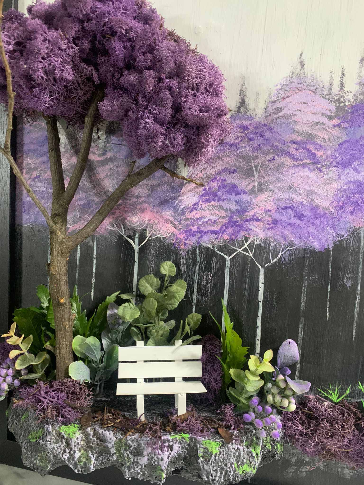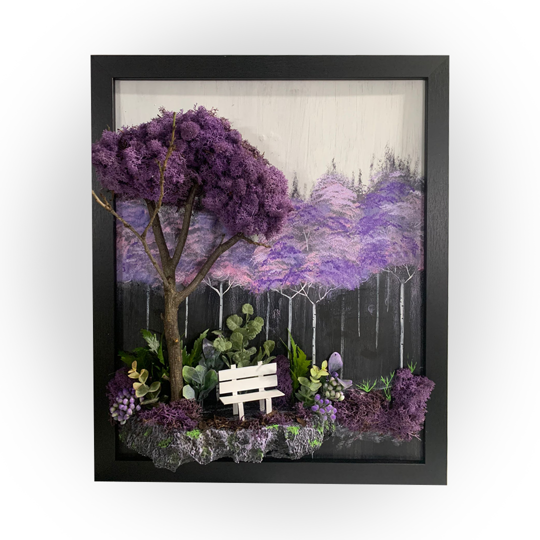 În tabloul Purple de 50x45 cm, un copac masiv isi intinde ramurile intr-un decor natural in nuante delicate de mov. Langa el, o banca simpla invita la contemplare si liniste. Pictura emana o atmosfera calma si linistita, transmitand senzatia de refugiu si pace in mijlocul naturii incantatoare.