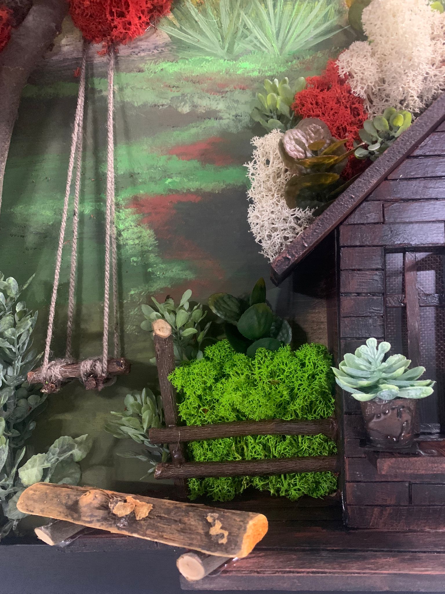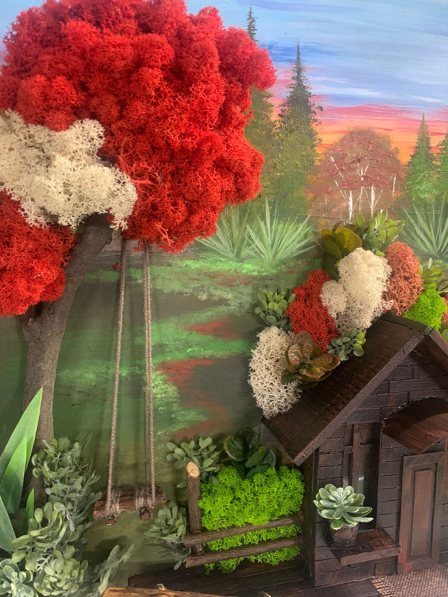 În tabloul de 50x40 cm, o casa pitoreasca se înalta în vecinatatea unui copac înflorit, iar lânga acesta se gaseste un leagan singuratic. Scenele se întrepatrund, sugerând o poveste simpla si fermecatoare a vietii de zi cu zi, amplificând atmosfera de liniste si caldura a unui camin în mijlocul naturii.
