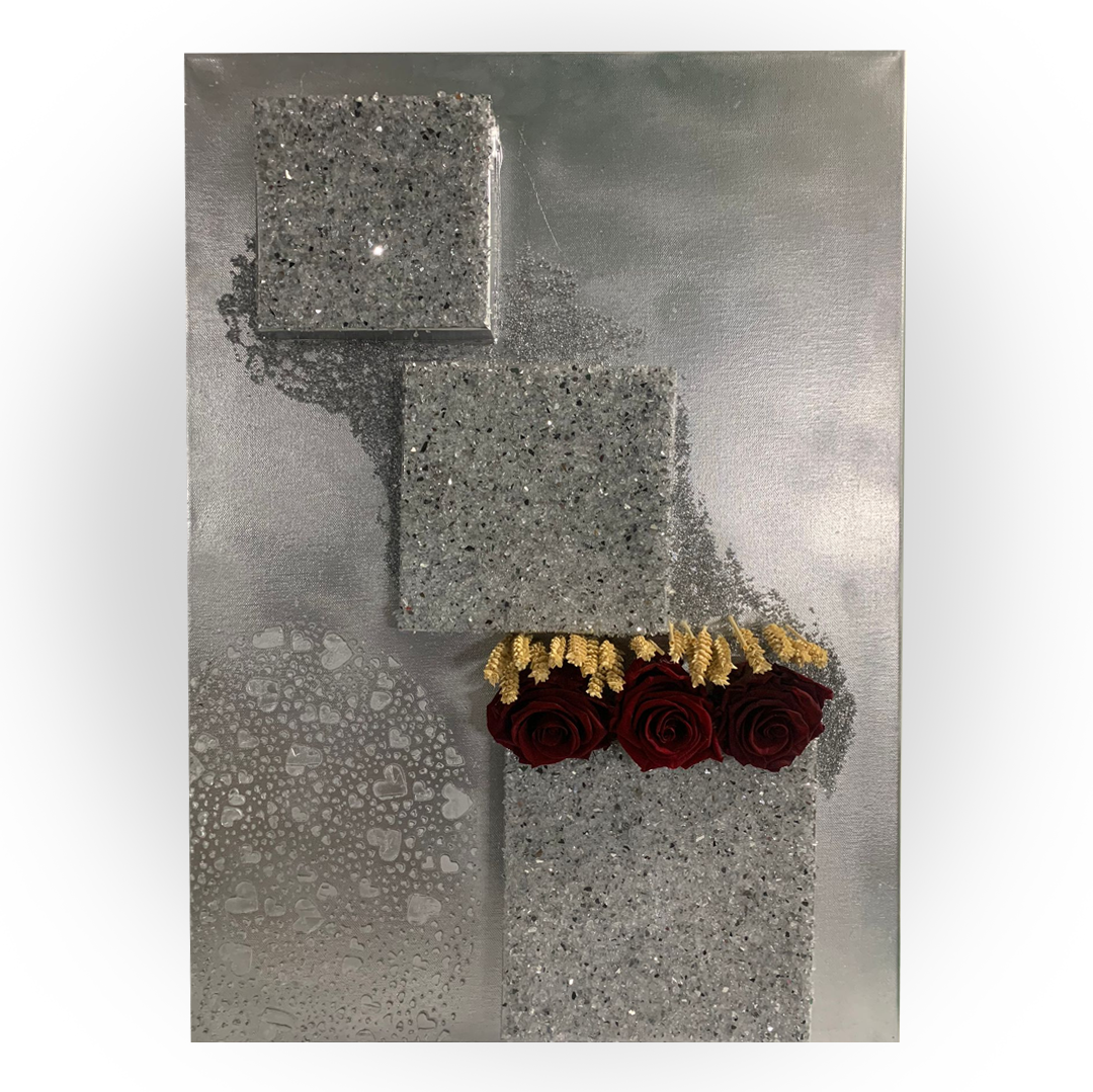 In tabloul Silver Dust de 70x50 cm, particulele de argint imitand metalul reflecta subtilitatea si eleganta, completate perfect de prezenta a trei trandafiri criogenati in nuante intense de rosu. Contrastul dintre stralucirea metalica si frumusetea naturala a trandafirilor sugereaza o armonie intre modernitate si farmecul clasic, captivand atentia si aducand un aer distinct si rafinat.