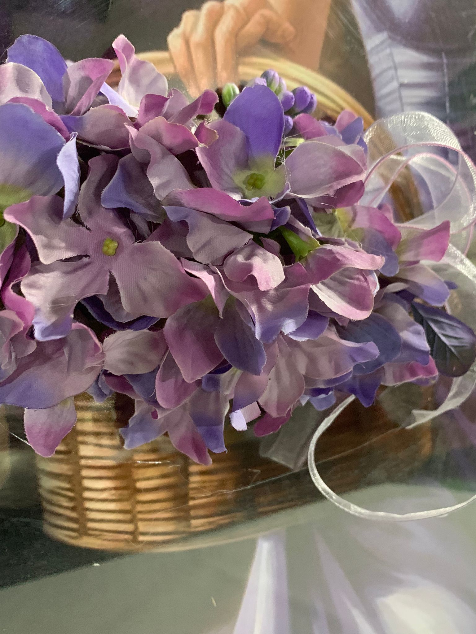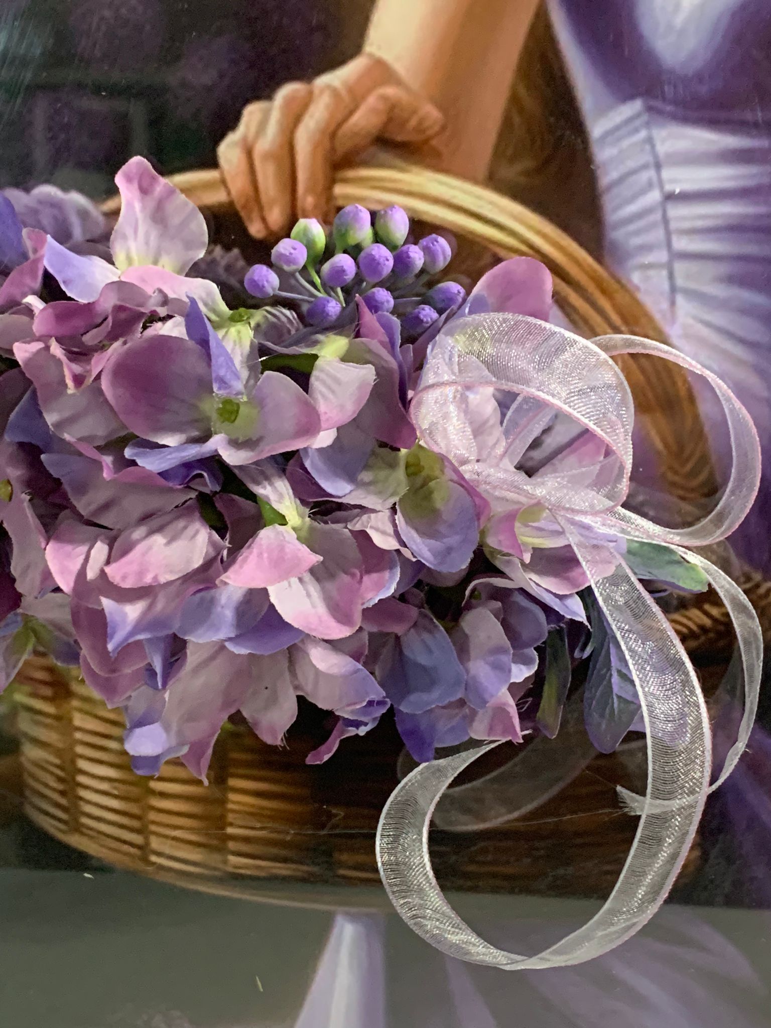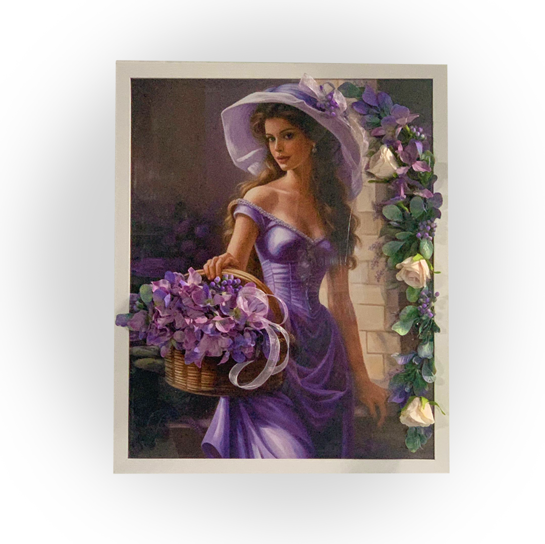 In acest tablou de 40x50 cm, o femeie eleganta sta langa un cos de flori, cu nuante imbietoare de mov. Privirea ei tandra se imbina perfect cu buchetul plin de viata, creand un spectacol cromatic fermecator si plin de armonie.
